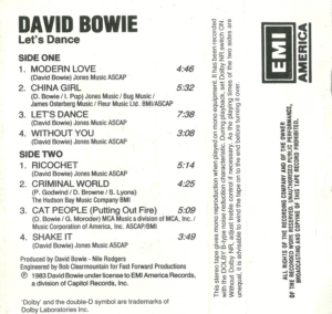 TAPE STUDIO ALBUMS PartagezÉpingleTweetez0 Partages David Bowie – Space Oddity – The Man Who Sold The World – Hunky Dory – Ziggy Stardust – Aladdin Sane – Pin Ups – Diamond Dogs – Young Americans – Station To Station – Low – Heroes – Lodger – Scary Monsters – Let’s Dance – Tonight – Never Let Me Down – Tin Machine – Tin Machine II – Black Tie White Noise – Outside – Hearthling – Hours – Heathen – Reality – The Next Day – Blackstar – Toy 1978 FRANCE 1980 FRANCE 1981 EUROPE 1983 FRANCE MY FIRST EVER ITEM OF DAVID BOWIE ! ! ! 1983 FRANCE 1983 SPAIN 1983 THAILAND 1984 SINGAPORE - MALAYSIA - HONG-KONG 1987 GERMANY 1987 GERMANY 2022 EUROPE - Green ltd edition, 10000 copies sold in pop up stores DAVID BOWIE 75 around the world